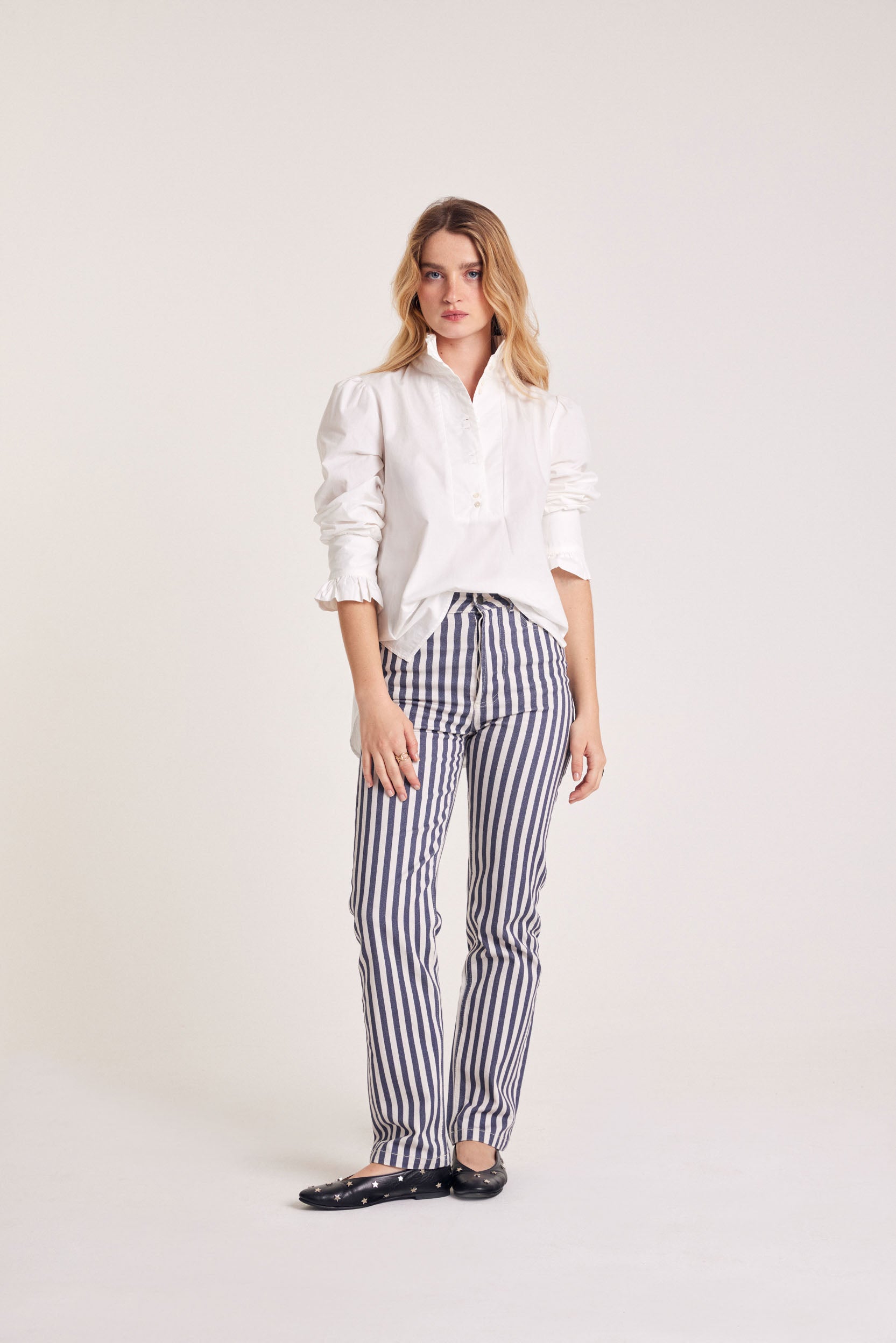 Our T.P.R. (Always More Responsible) denim jeans now feature navy and ecru stripes! Their subtly wide straight-leg cut structures and flatters the silhouette for a look that's both chic and relaxed.