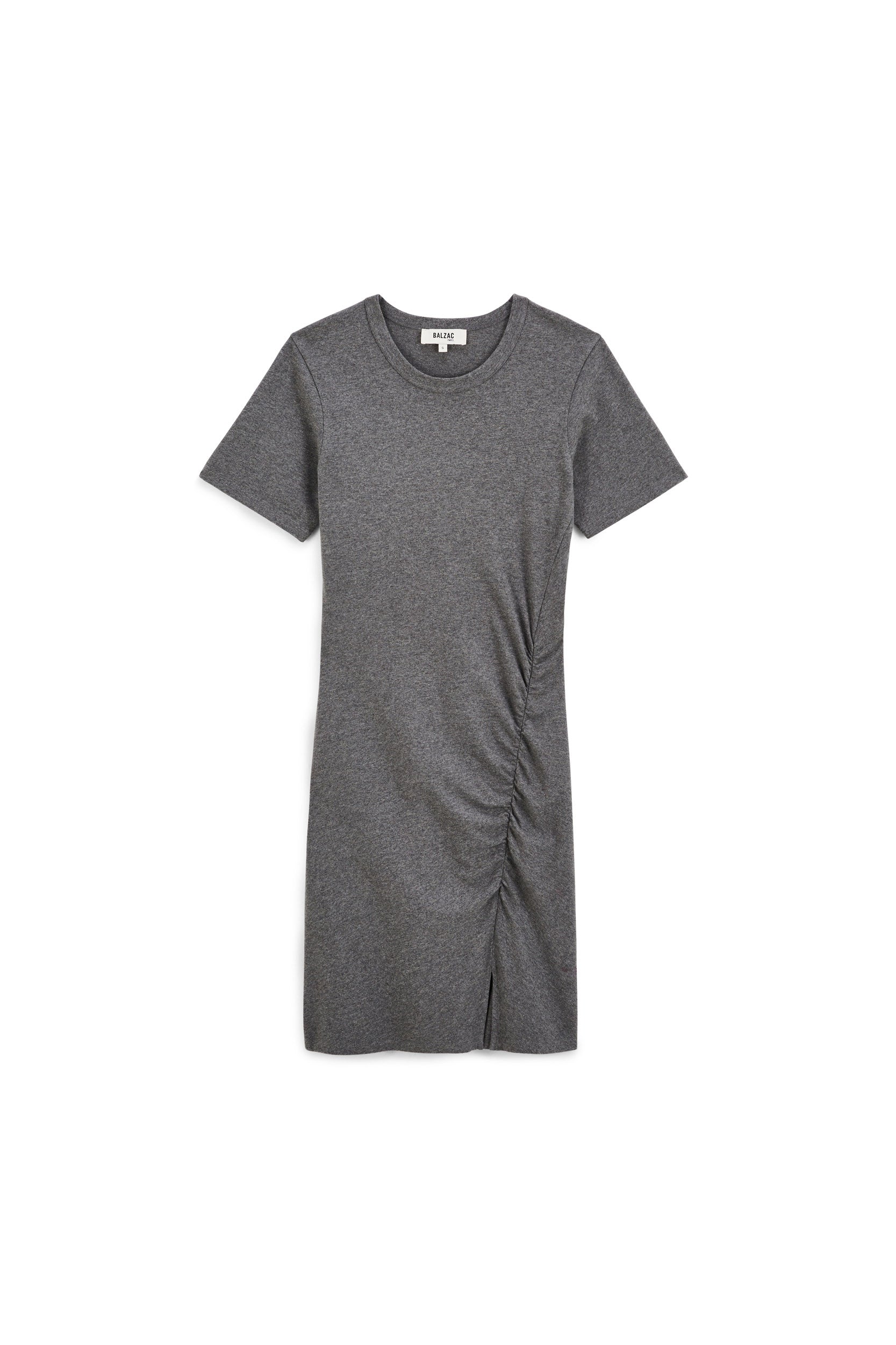 The charcoal gray Floréal dress is fitted to the body and creates a slim silhouette with its side slit.