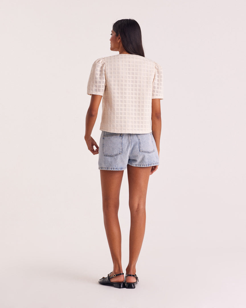 Avec une blouse ou un débardeur, le mini short Triomphe bleu glacier se porte dès l'arrivée des beaux jours.
