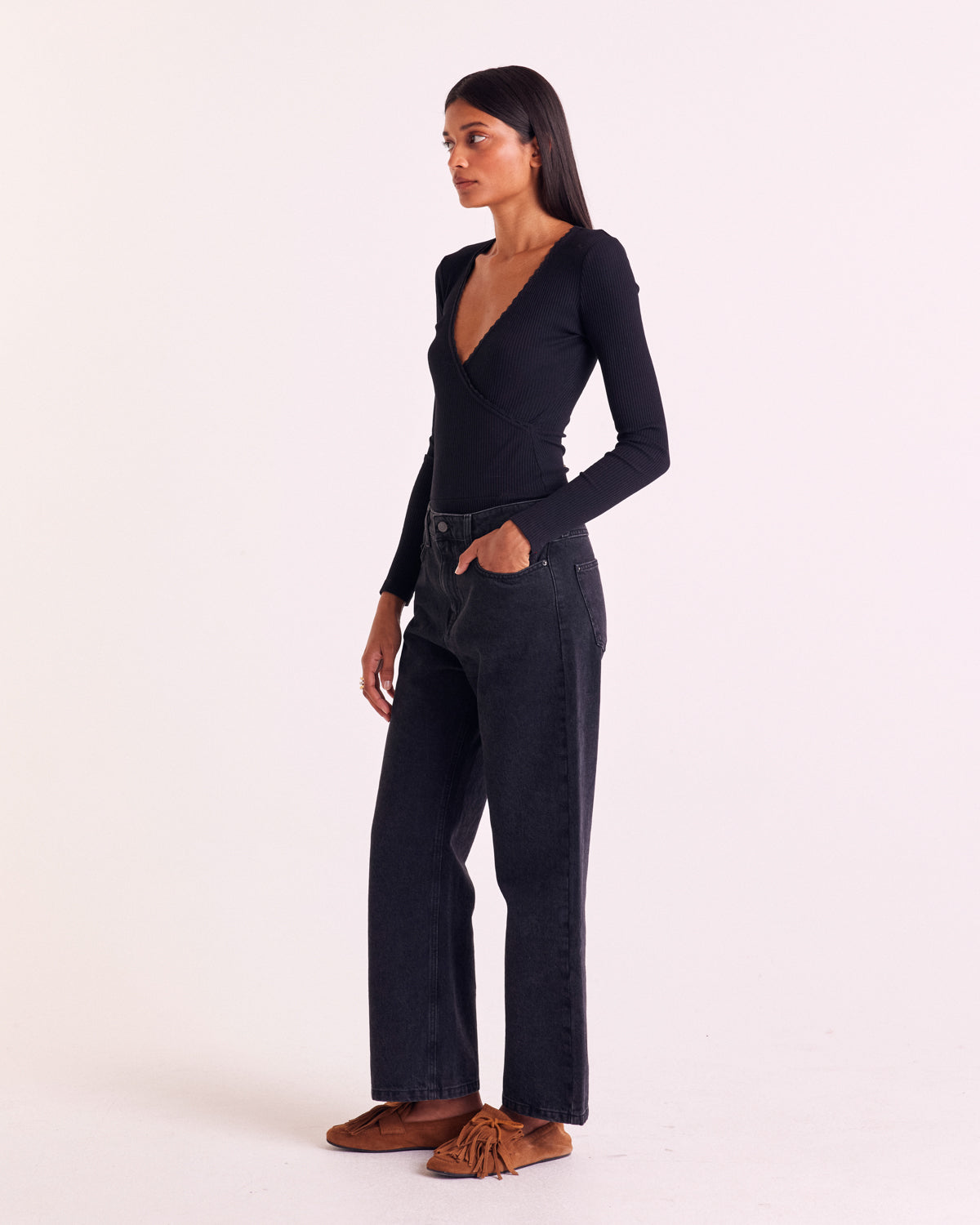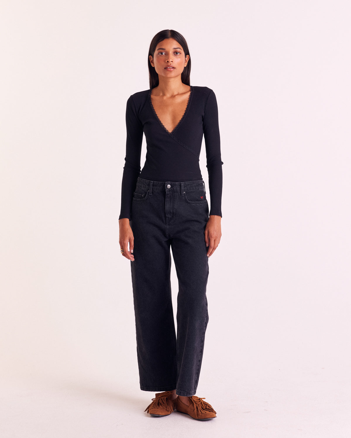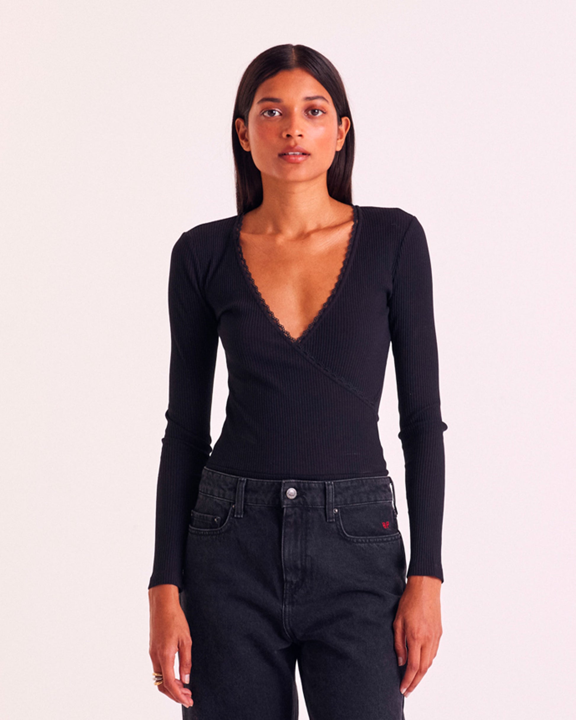 Le body Matthew revient dans un coloris noir ! Sa maille à rayures, son effet cache-coeur dentelé et sa matière écoresponsable font partie de ses atouts.