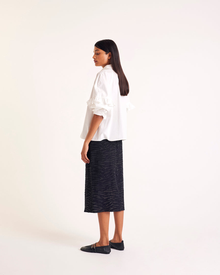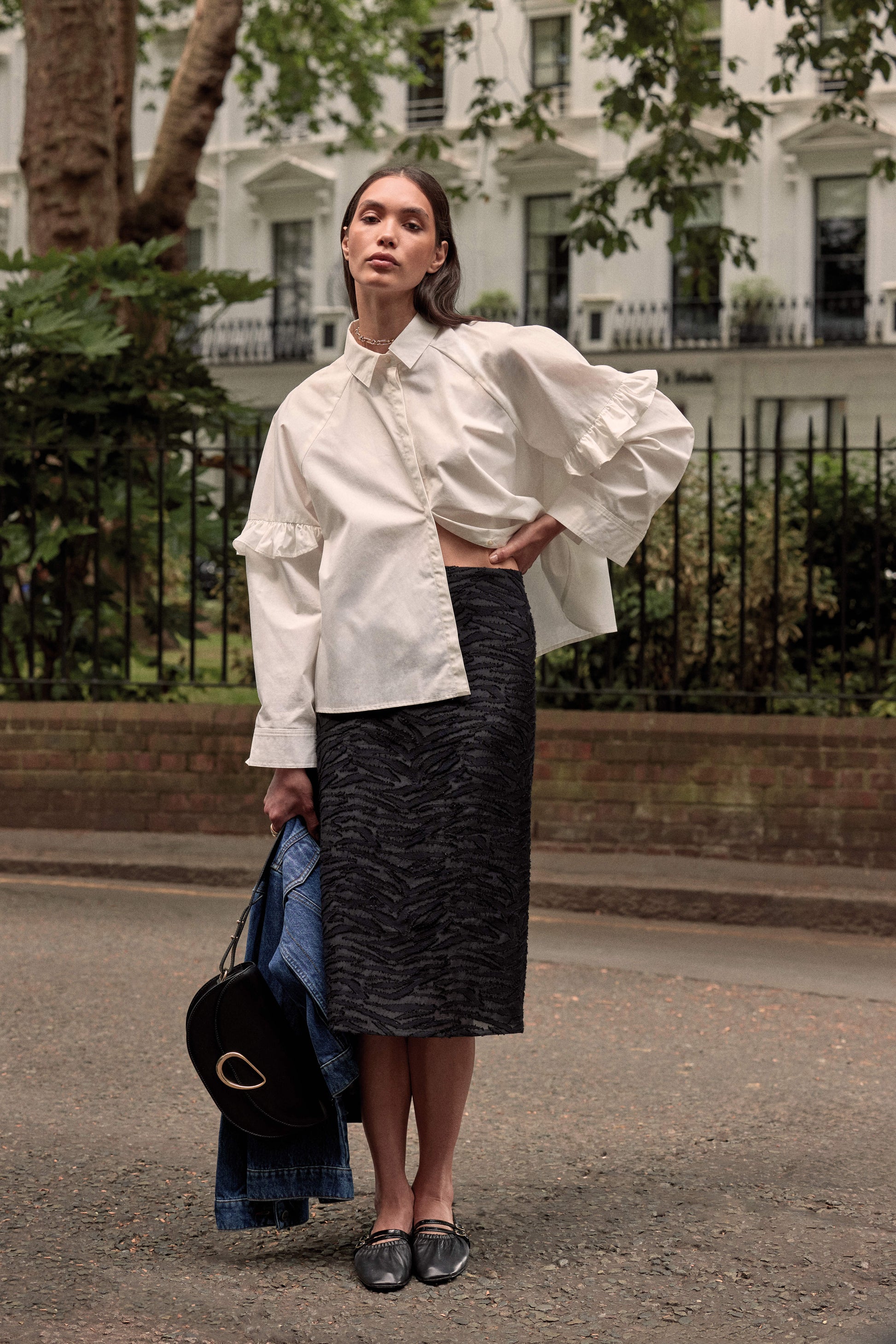 • Doublure volante qui ne va pas jusqu'au bas de la jambe pour jouer avec la transparence de la matière