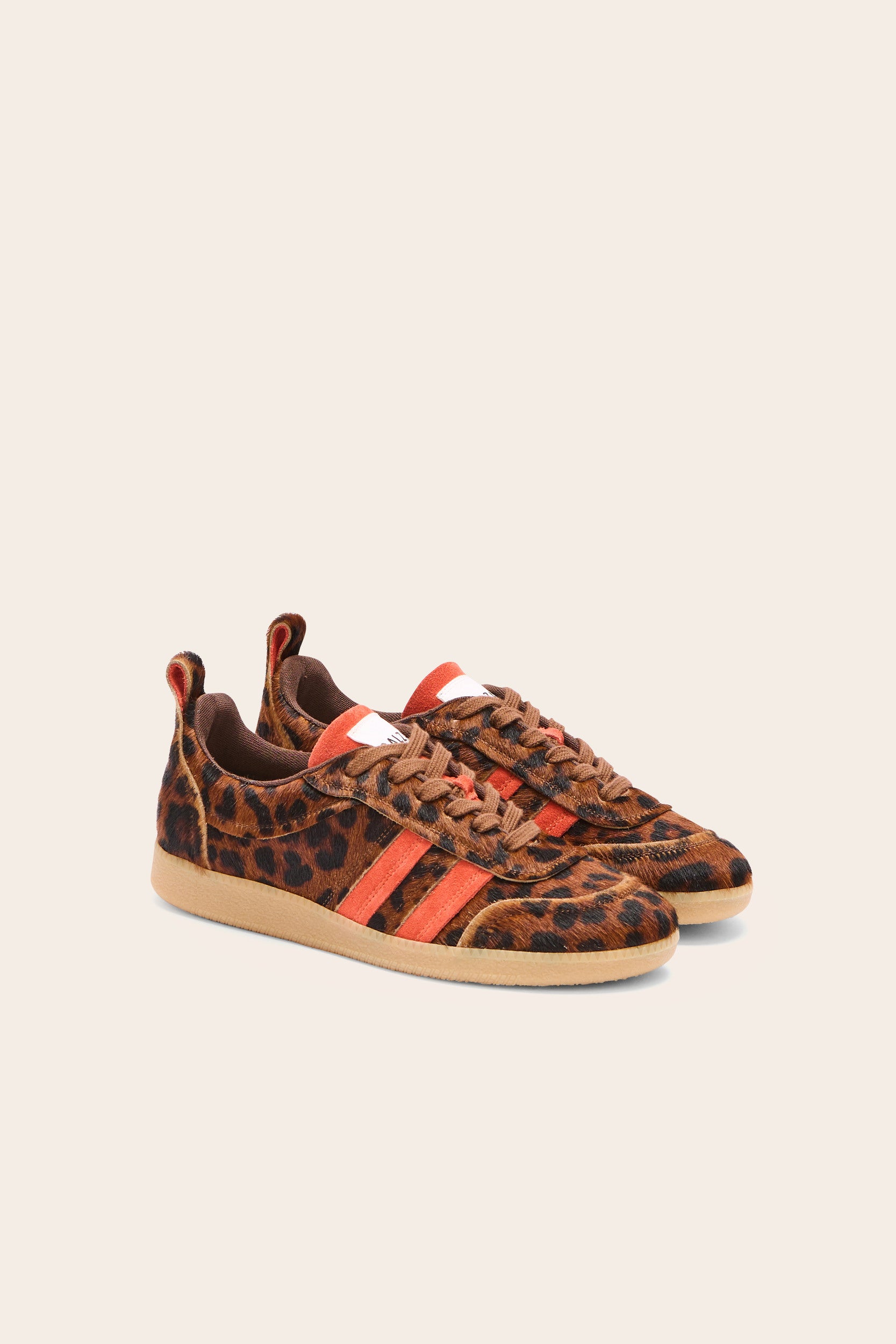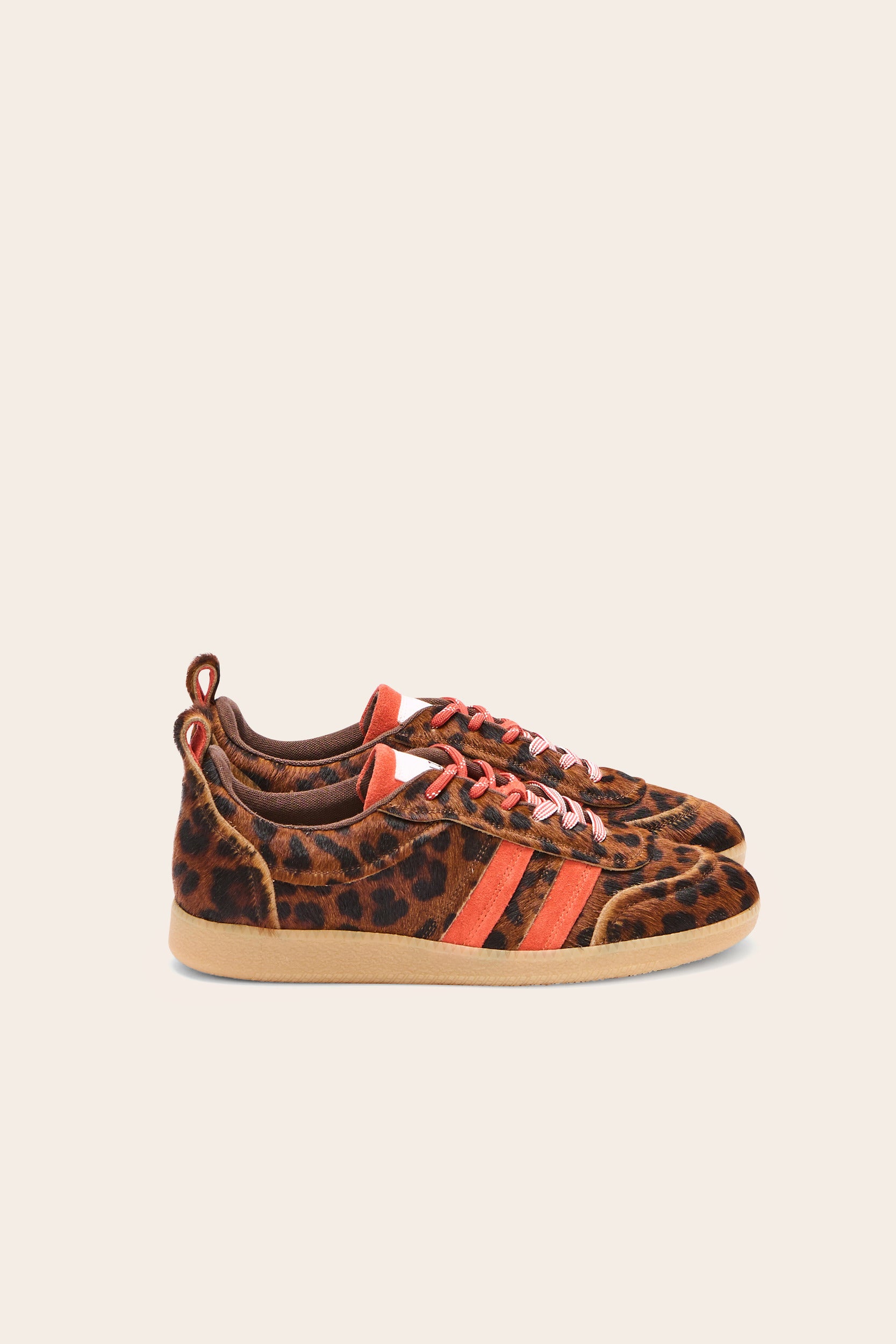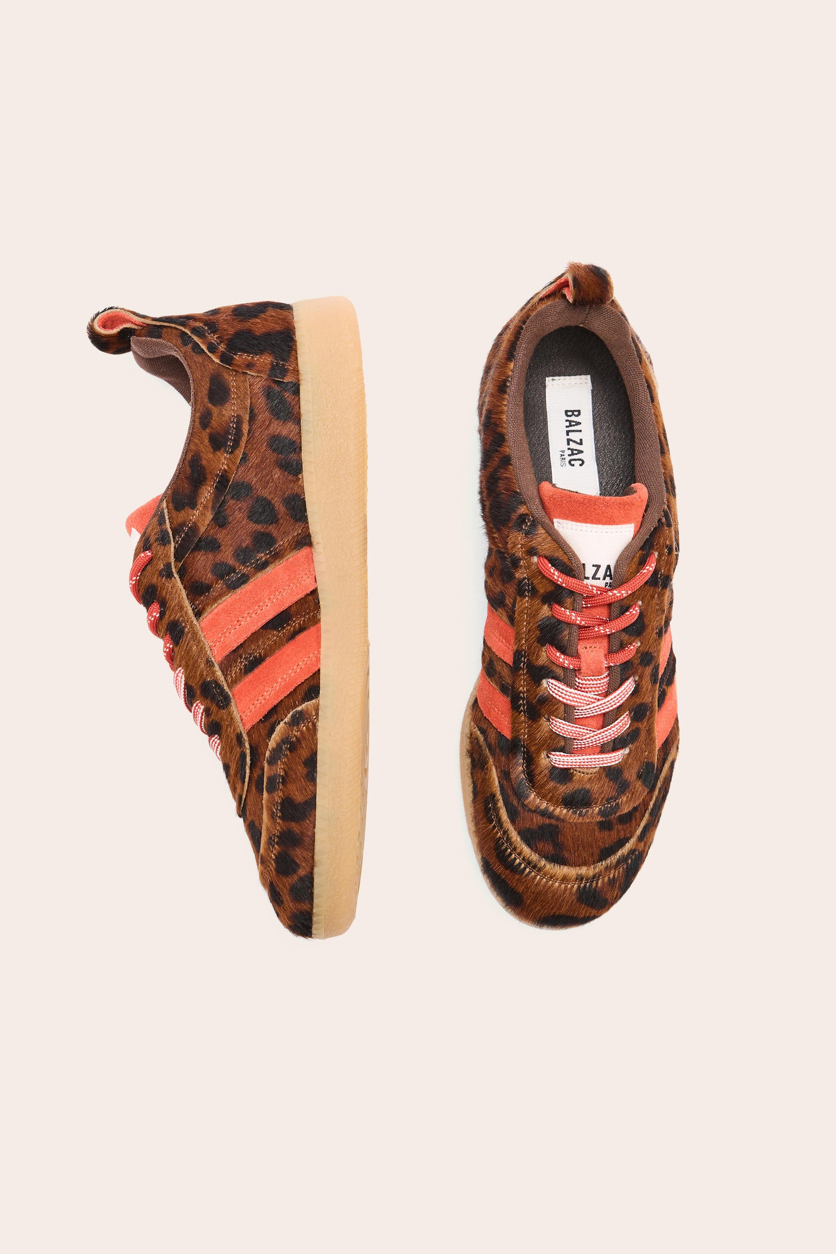 - Modèle en pony léopard fauve avec empiècements vermillon