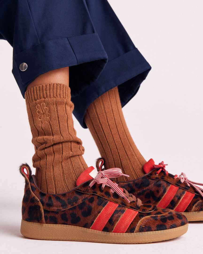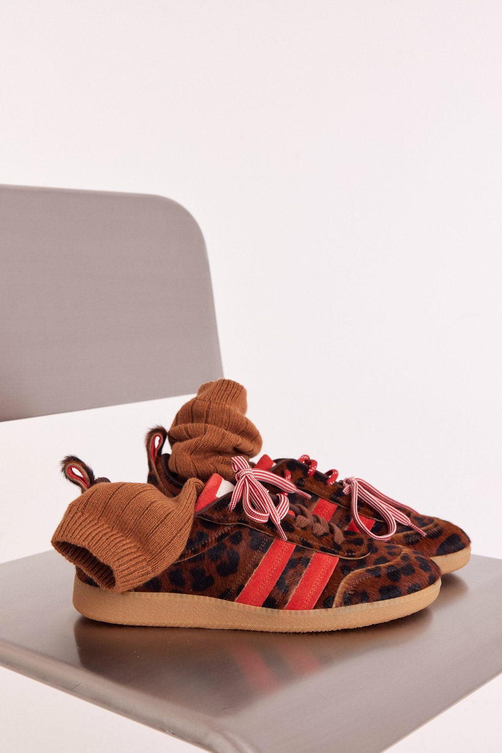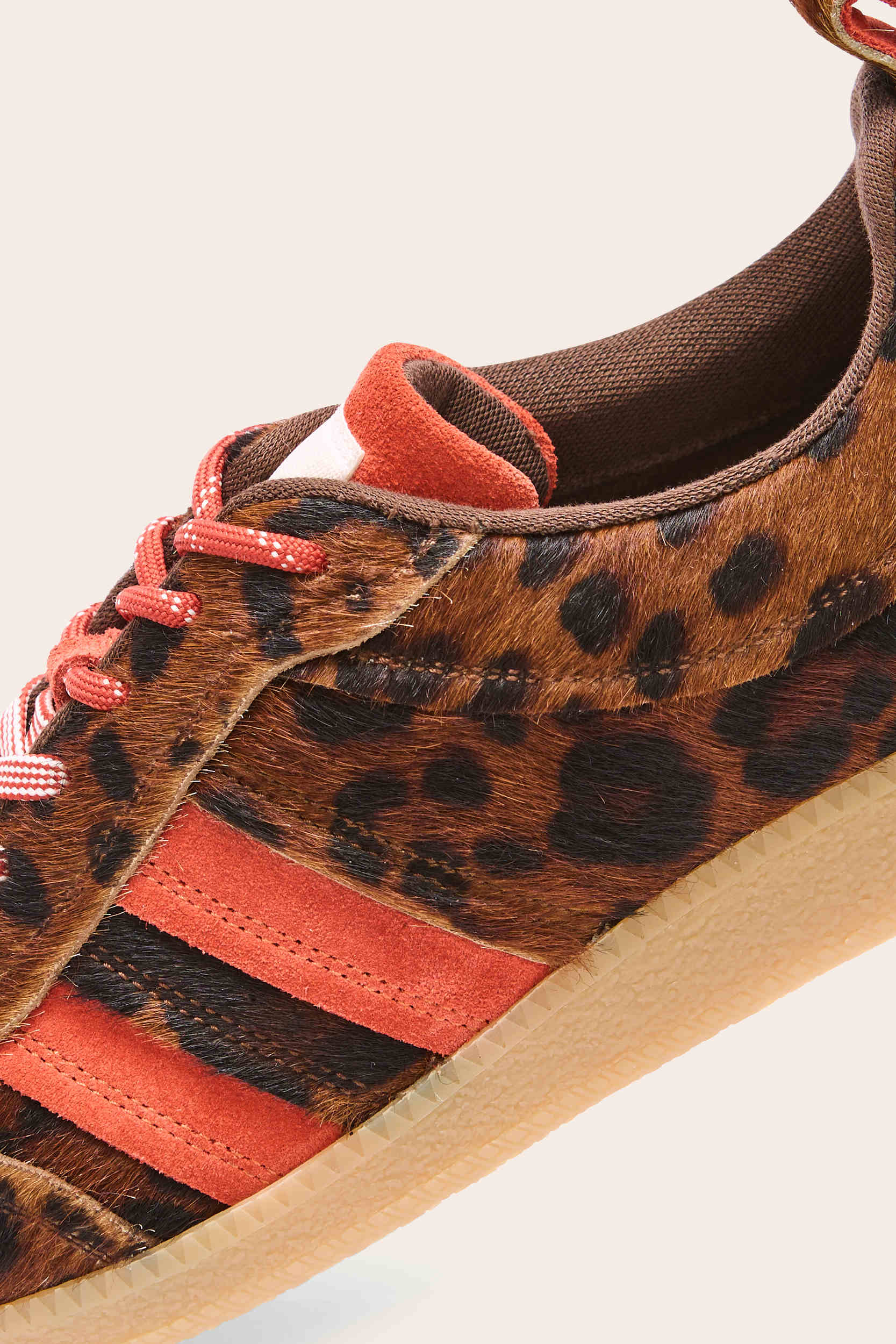 - Modèle en pony léopard fauve avec empiècements vermillon