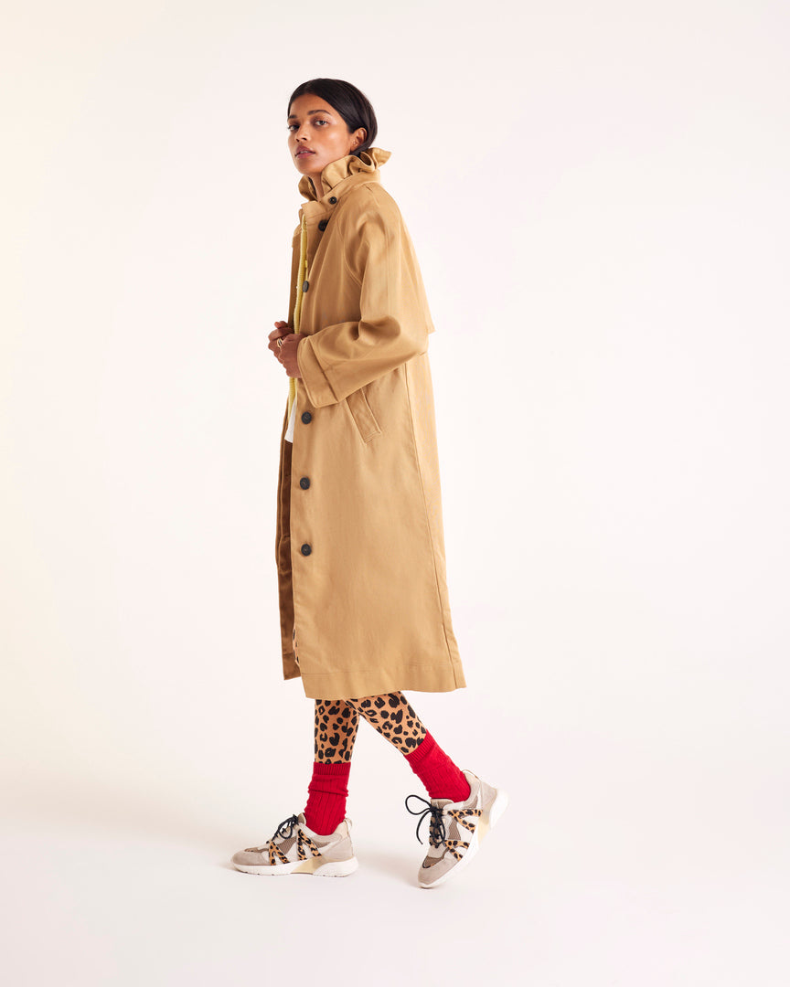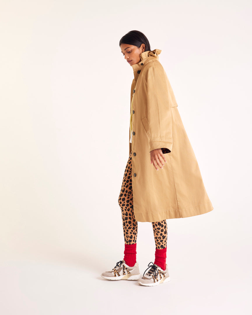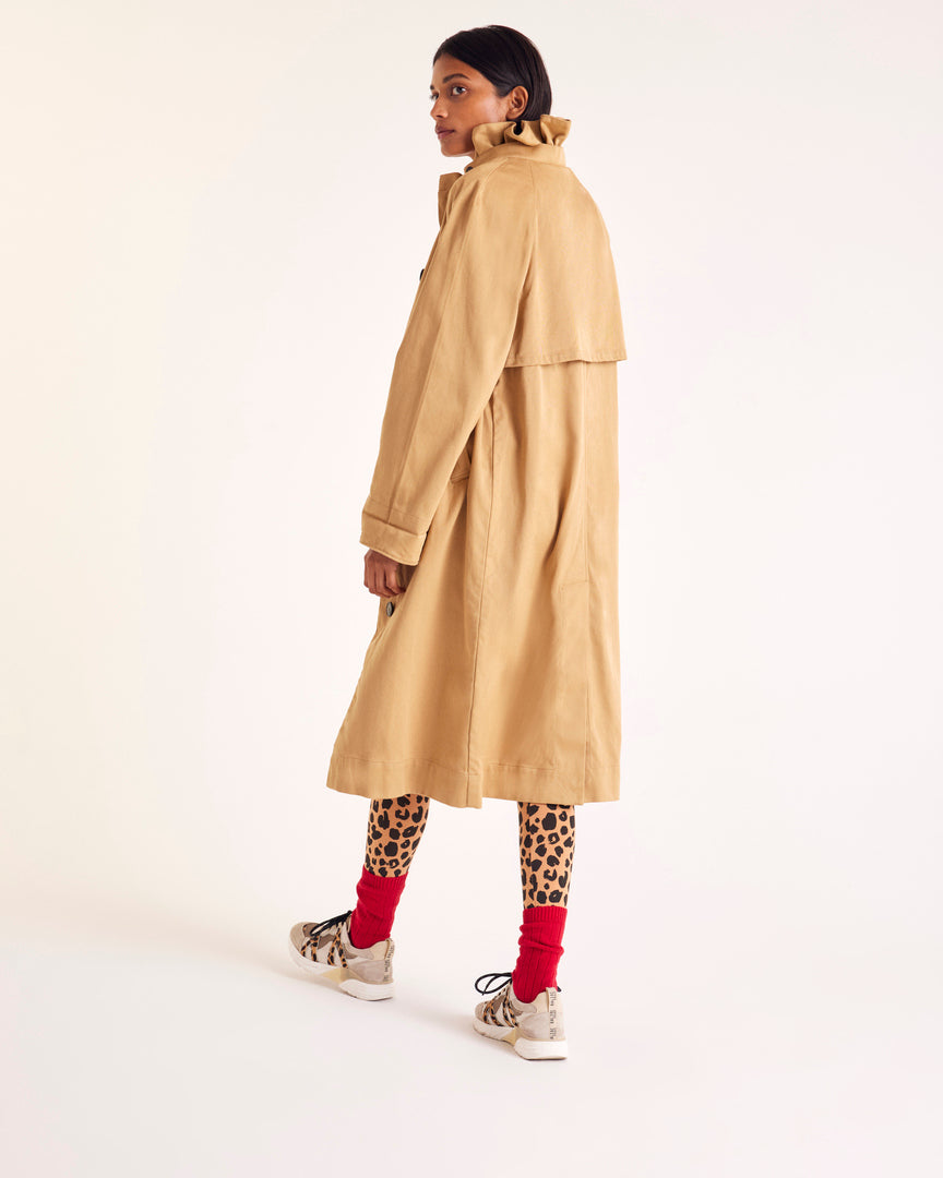 Iconique et audacieux, le trench Alma séduit par son col polyvalent à volant froncé, ses revers léopard et sa finition intérieure soignée, pour un style romantique et assumé.