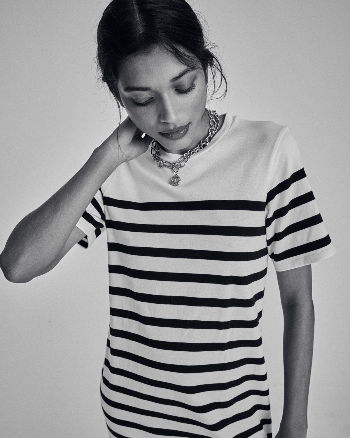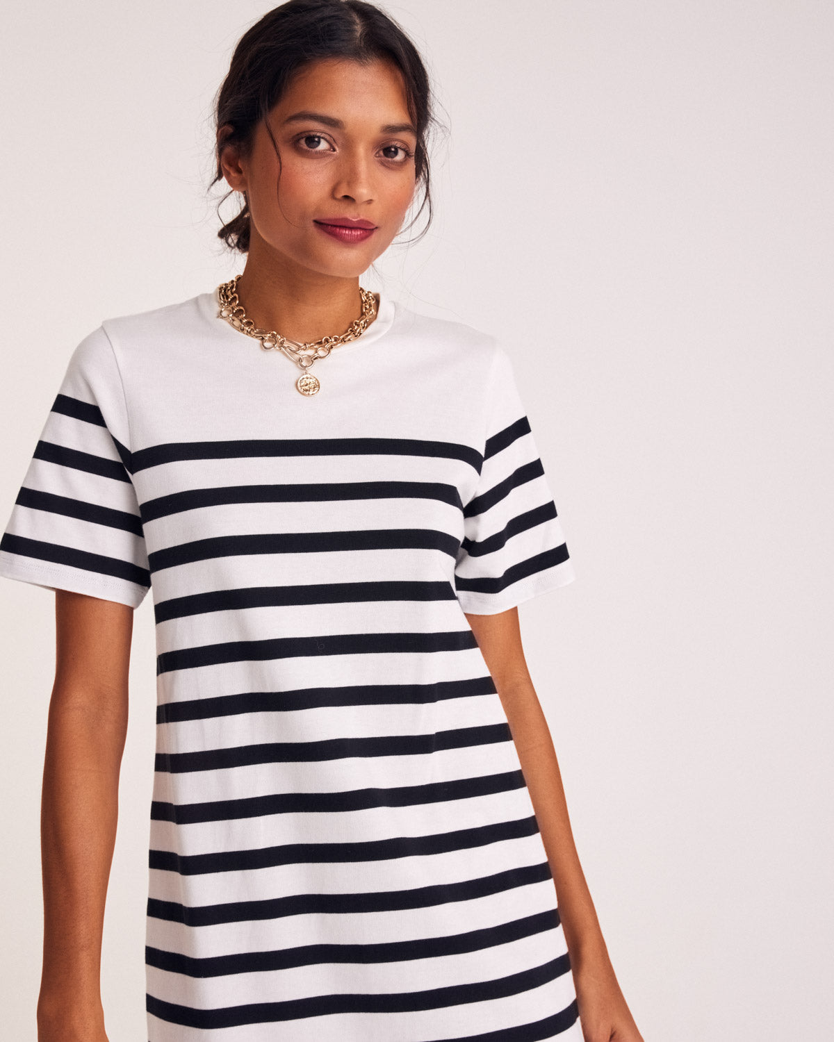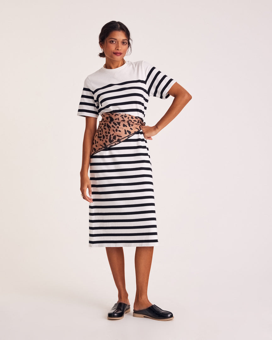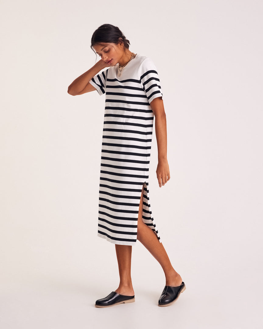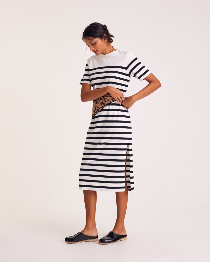 La robe Claodia à rayures noires, féminine grâce à sa fente sur le côté et sa coupe évasée au niveau des hanches. Simple et efficace à porter pendant la saison estivale.